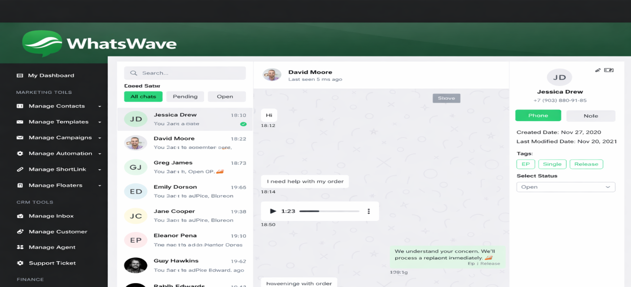 WhatsWave is a complete cross-platform WhatsApp CRM and marketing tool that helps businesses manage conversations, automate customer engagement, and run marketing campaigns through WhatsApp.